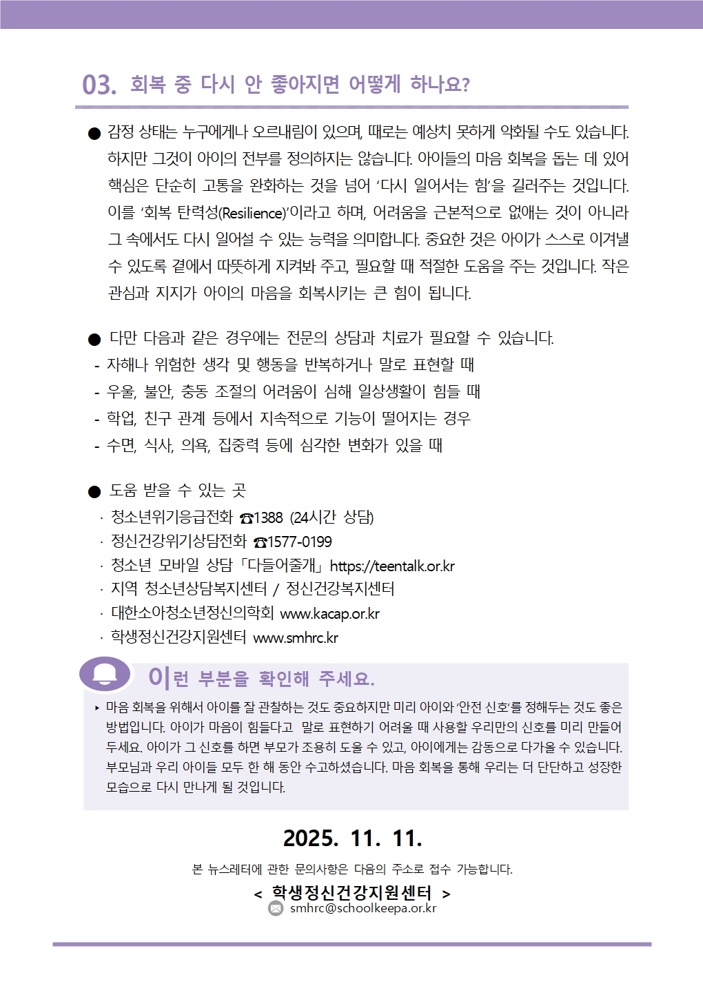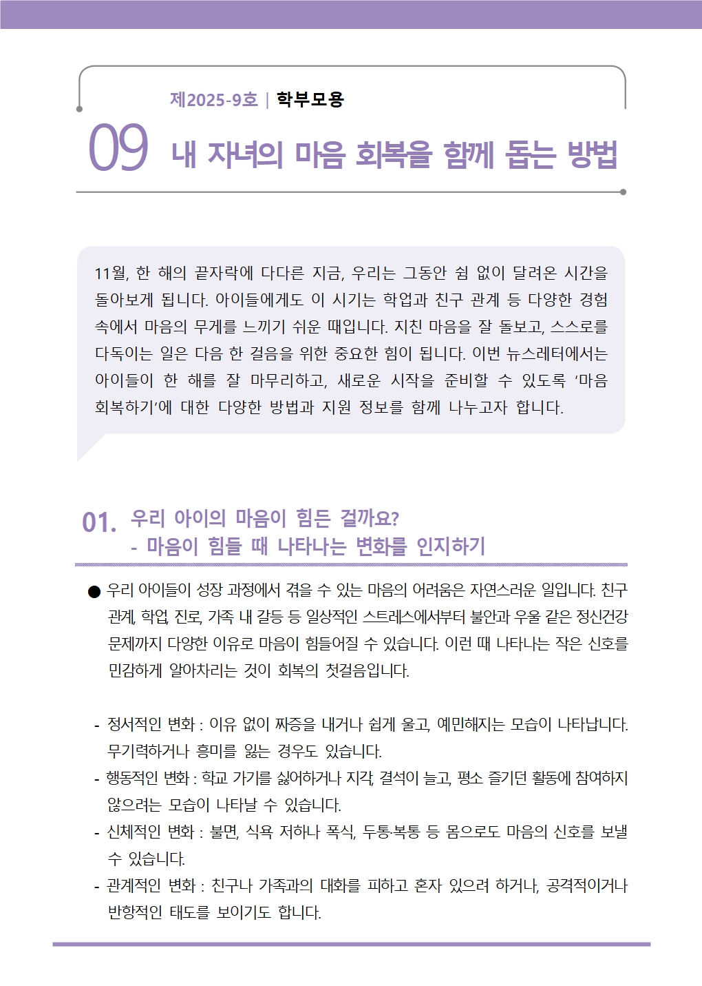 학생 정신건강 증진 뉴스레터 9호 안내